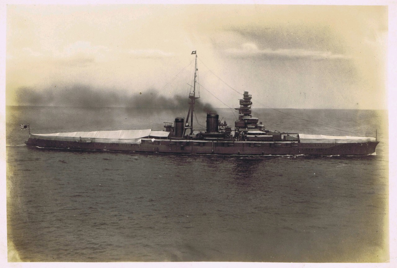 お召し艦「比叡」2。前後にテントっぽい屋根が。陛下乗船の旗しきものがマストに。